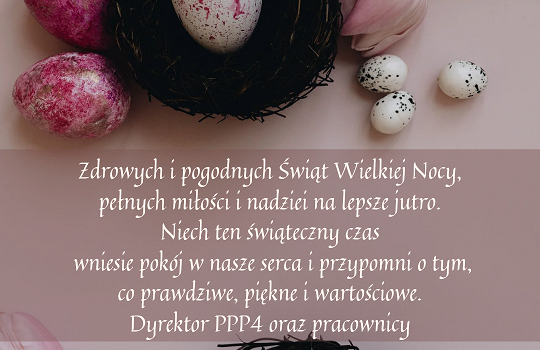 Zdrowych i pogodnych Świąt Wielkiej Nocy, pełnych miłości i nadziei na lepsze jutro. Niech ten czas wniesie pokój w nasze serca i przypomni o tym, co prawdziwe, piękne i wartościowe. Dyrektor PPP4 oraz pracownicy